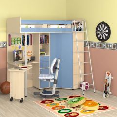 Кровать-чердак "Теремок-М85" - это целый комплекс мебели, включающий в себя спальное место размером 200*80 см, шкаф для одежды, пенал с ящиками и полноценный рабочий стол. Прочная конструкция рассчитана на детей до 16 лет. Такой уголок экономит пространство в детской комнате, при этом обеспечивая все необходимые функции.