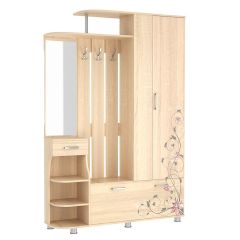 Состоит из: шкафа с выдвижной штангой, вешалки с крючками для одежды и сумок, обувницы, открытых полок, зеркала, полки для головных уборов, выдвижного ящика. Сборка универсальная, рисунок на фасадах не универсальный. На прихожей в цвете белый рамух нет рисунка.
